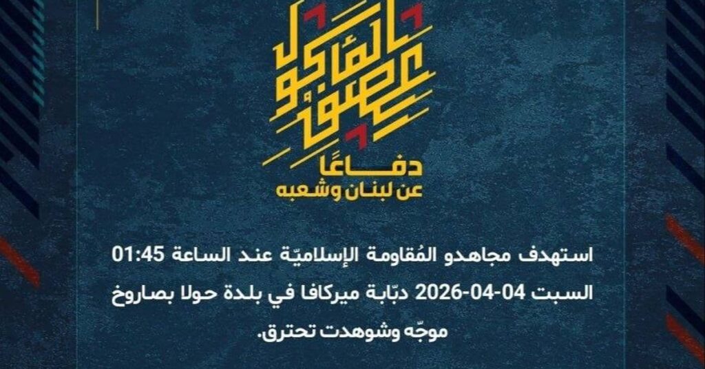 Posted onApril 4, 2026inWorld Hezbollah Claims Successful Missile Strike on Israeli Merkava Tank in Syria