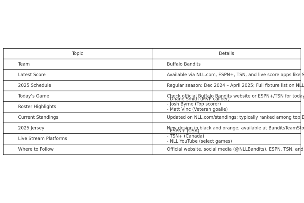 The Buffalo Bandits are one of the most iconic teams in the National Lacrosse League (NLL), known for their fierce gameplay, passionate fanbase, and strong legacy in professional box lacrosse. Whether you’re a long-time supporter or a new fan, staying up to date with the Buffalo Bandits’ score, schedule, jersey updates, standings, roster, game today, and live stream info for 2025 is essential.