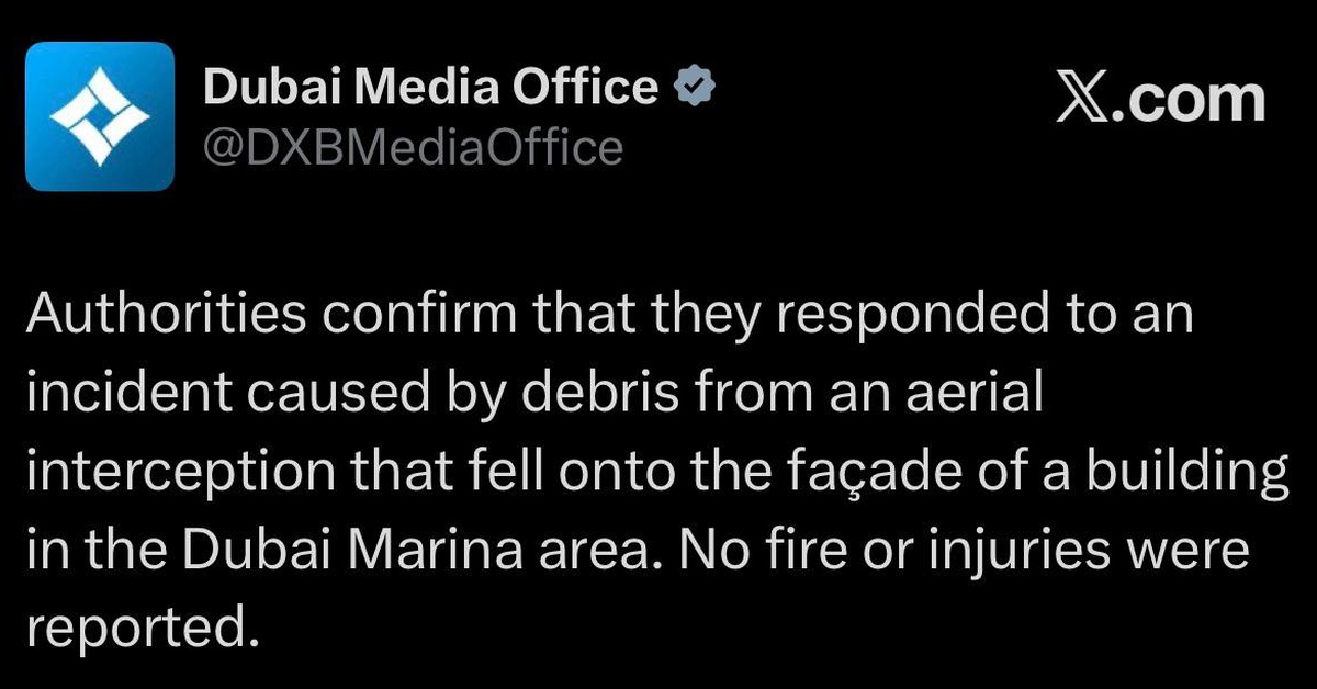 Dubai, United Arab Emirates – Authorities have issued a statement affirming their swift response to an incident caused by falling debris from an aerial interception in the Dubai Marina area today. The incident did not result in any reported fires or injuries, according to officials.