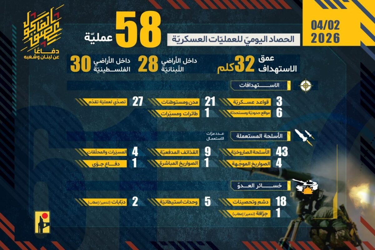 **Hezbollah Carries Out 58 Operations Against Israeli Forces in Palestine and Lebanon**
