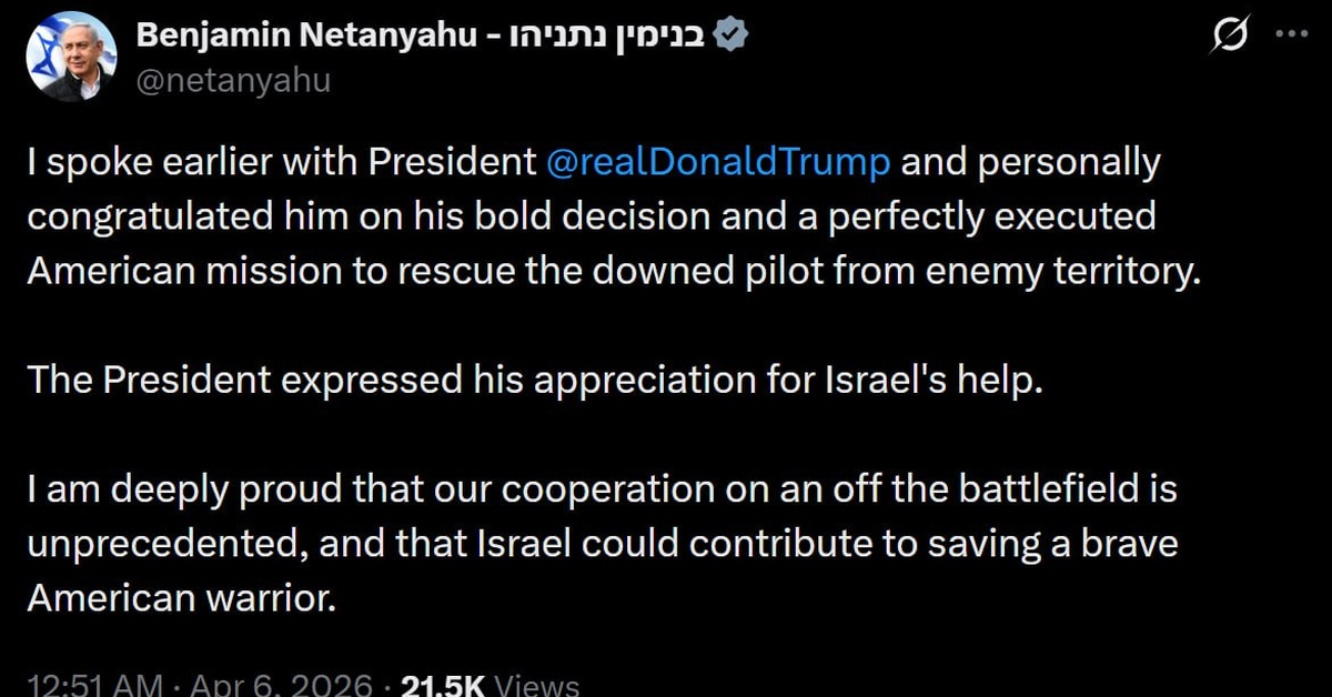 “I spoke earlier with President Trump and personally congratulated him on his bold decision and a perfectly executed American mission to rescue the downed pilot from enemy territory,” Netanyahu stated. “The President expressed his appreciation for Israel’s help.”