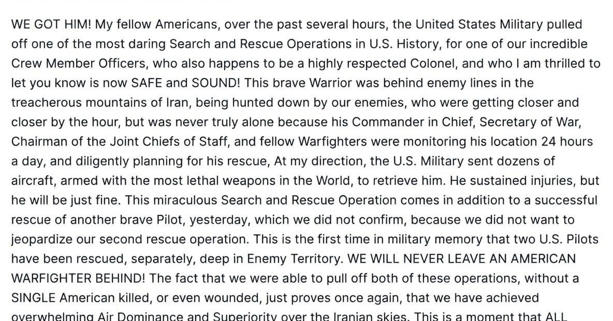 Washington D.C. – In a press conference held at the White House earlier today, President Donald Trump addressed the nation with significant updates regarding a critical foreign rescue mission. The President announced with great fanfare the successful rescue of an American pilot, confirming the long-awaited news has finally arrived.