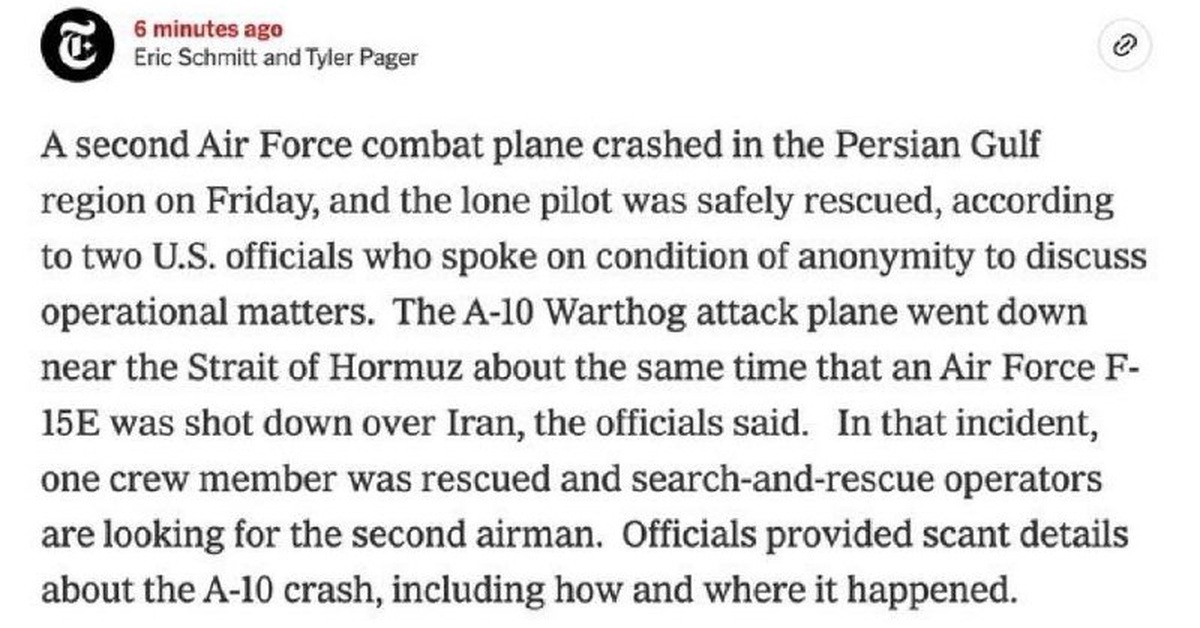 A second U.S. Air Force aircraft has crashed over the past week, adding to growing concerns about military aviation safety in the region. On Friday, an A-10 Warthog plane experienced a mishap near the Strait of Hormuz, a vital shipping lane through which approximately one-fifth of the world’s oil passes. Fortunately, the pilot was able to safely eject from the aircraft prior to its impact.
