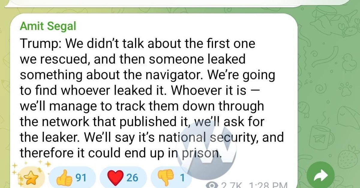 The first hint of the leaked information came from Israeli journalist Amit Segal, who boasted about having information on the successful rescue of one crew member. However, he later clarified that he was not certain if he was the first to break the news, but refused to reveal his source. Trump was furious about the leak, labeling it a “sick person’s” action and threatening severe consequences for the media outlet involved.