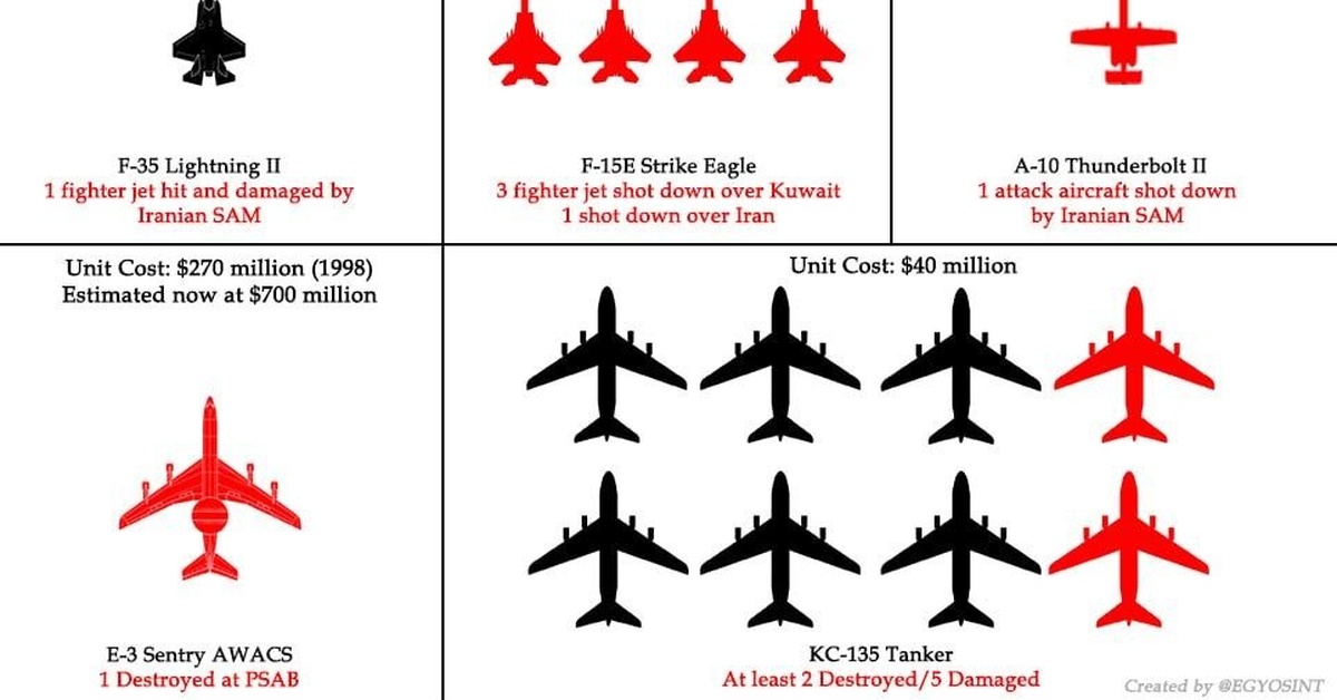 Other losses include one E-3G Sentry Airborne Warning and Control System (AWACS) aircraft, which was destroyed in the latest round of hostilities. The US military also reported significant losses among its tanker fleet, with eight KC-135 aircraft sustaining damage or being destroyed. While one of these aircraft was actually destroyed in the air, another was destroyed at its base, and two were severely damaged in separate incidents. In addition, five KC-135s suffered damage that, while not as severe, will require lengthy repairs.